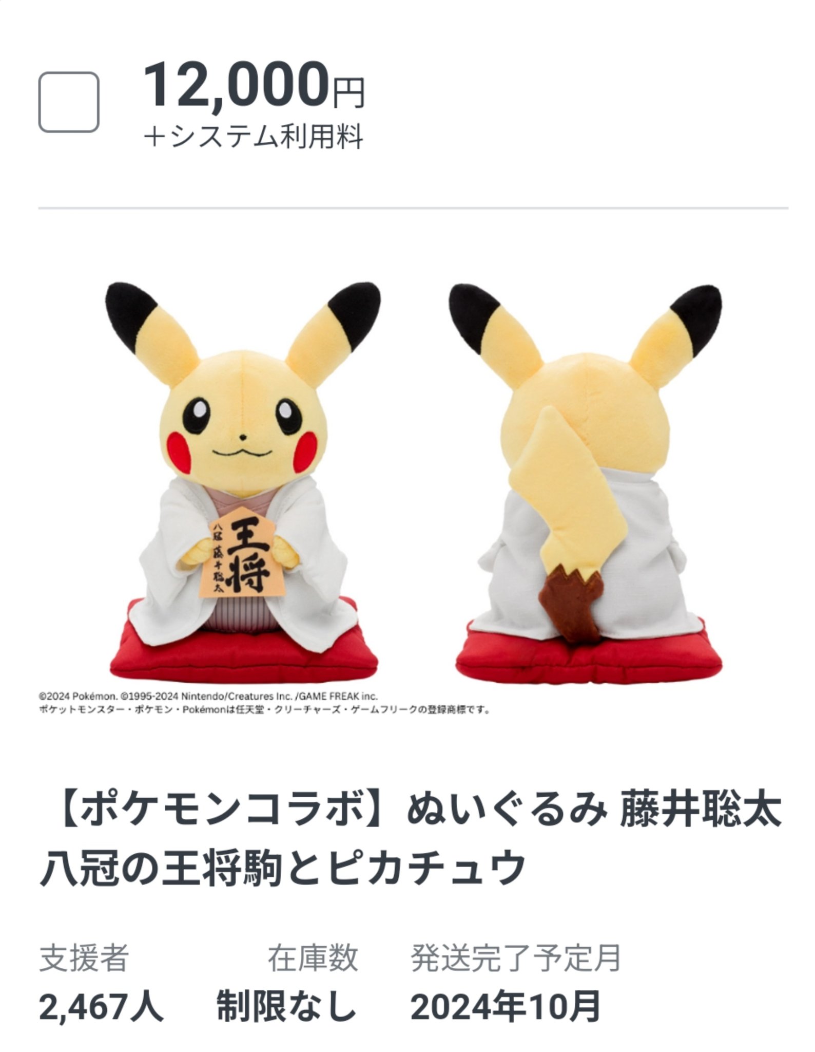 | 商品の特徴 | Pikachu ポケモン ピカチュウ 藤井聡太 ぬいぐるみ 将棋 非売品。激レアプレミア付】ピカチュウ 将棋ぬいぐるみポケモン ピカチュウ。激レアプレミア付】ピカチュウ 将棋ぬいぐるみポケモン ピカチュウ。ぬいぐるみ 藤井聡太八冠の王将駒とピカチュウです╰(*´︶`*)╯♡未開封新品です。宜しくお願いします。ピカチュウの着物は、藤井聡太八冠が全タイトルを取った第71期王座戦第4局で着ていたものをイメージしたデザインです(*⁰▿⁰*)手に持っている駒には藤井聡太八冠が今回のために書き下ろした王将の揮毫が印刷されております。薄いグレーの羽織、くすみピンクの着物と縦縞の袴に、なんと座っていた座布団のカラーまで再現された、オリジナルの特別グッズとなっております(о´∀`о)【検索用】#ポケカ#ポケモン#WCS2023#ピカチュウ#ポケモンセンター#沖縄#沖縄限定#Pokmon#Japanonly#Kimono#JAPAN#buyee#BUYEE#楽一番#公式#ZenMarket。アウトレット ショップゲーム・おもちゃ・グッズ - 藤井聡太。☆ハンターハンター アートカードコレクション 1弾 全種セット 12個入り。ばぁうくん 色紙 纏め売り 騎士X STPR KnightX | ||